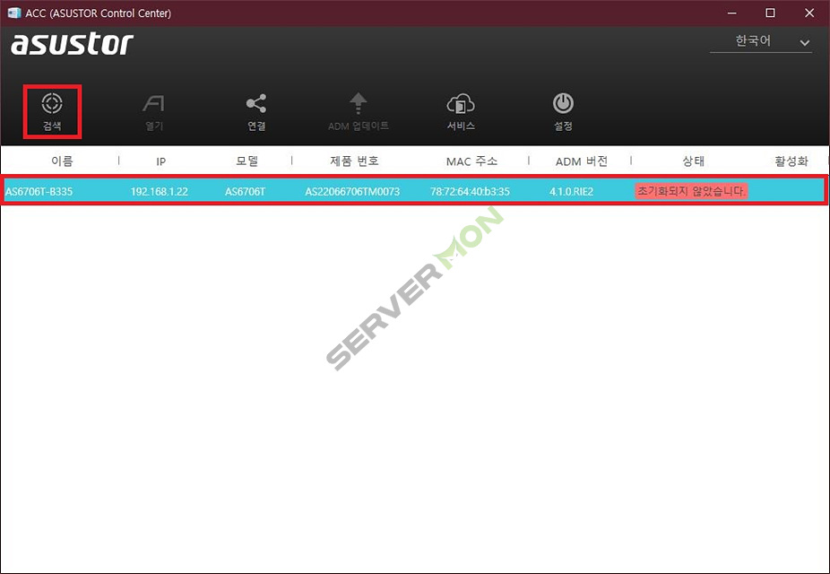좌측 상단의 [검색]버튼을 눌러 같은 네트워크에 연결된 NAS장비를 검색합니다.