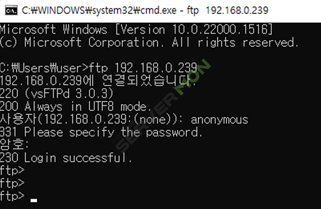 간단히 익명 사용자로 FTP 허용 여부 설정에 대해 yes 로 변경 후 PC 에서 cmd 환경에서 익명으로 로그인 시도를 해봤습니다.