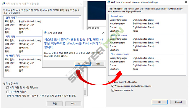 여기 까지 설정을 하신다면 윈도우의 표시 언어는 영어로 변경이 됩니다.