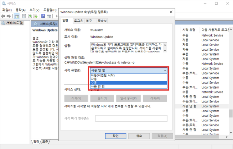 3. 윈도우 업데이트 기능 수동으로 변경