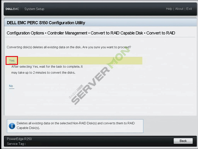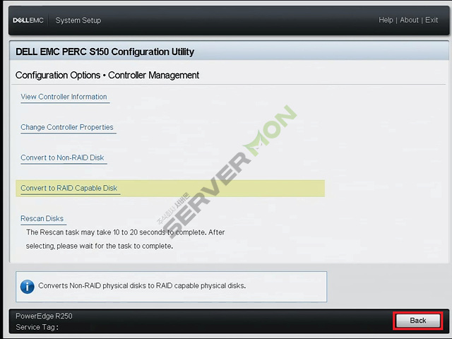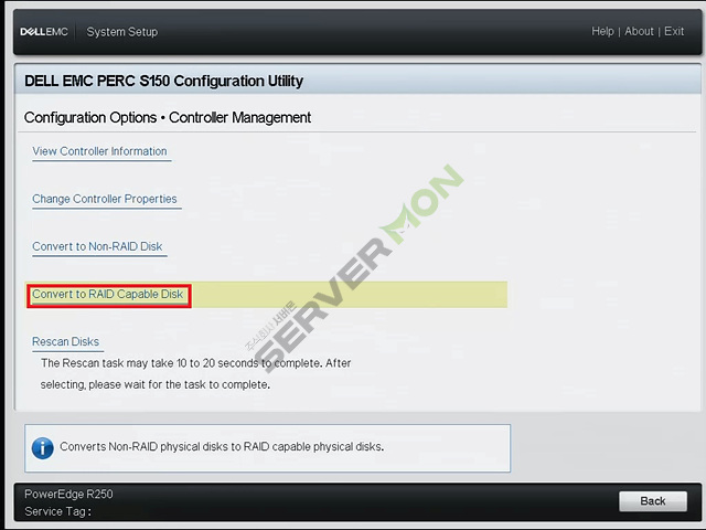 Controller Management 진입 후 아래의 사진에 표시된 부분을 참고하여 Convert to RAID Capable Disk로 진입합니다.