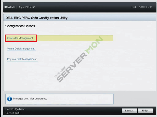 S150 Configuration Utility 진입 후 아래의 사진에 표시된 부분을 참고하여 Controller Management로 진입합니다.