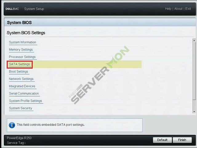 System BIOS Settings 진입 후 아래의 사진에 표시된 부분을 참고하여 SATA Settings로 진입합니다.