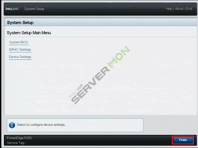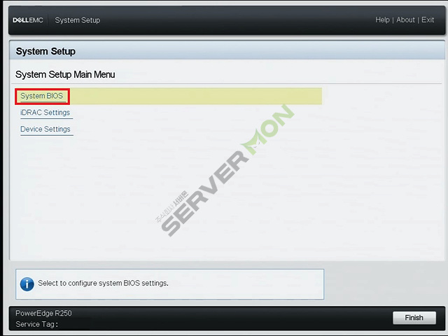 System Setup 진입 후 아래의 사진에 표시된 부분을 참고하여 System BIOS Settings로 진입합니다.