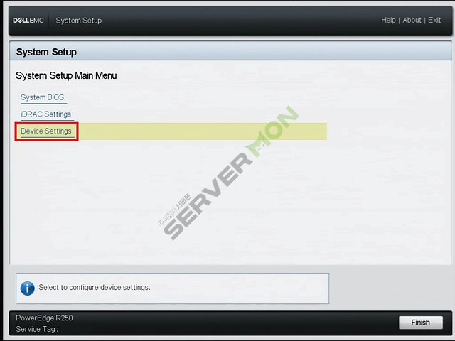 System Setup 진입 후 아래의 사진에 표시된 부분을 참고하여 Device Settings로 진입합니다.
