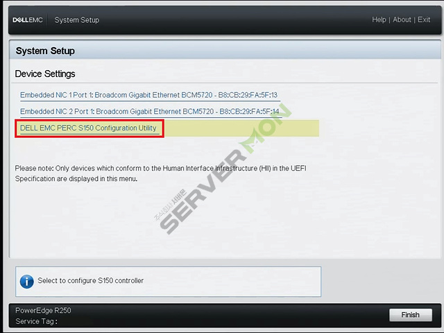 Device Settings 진입 후 아래의 사진에 표시된 부분을 참고하여 S150 Configuration Utility로 진입합니다.