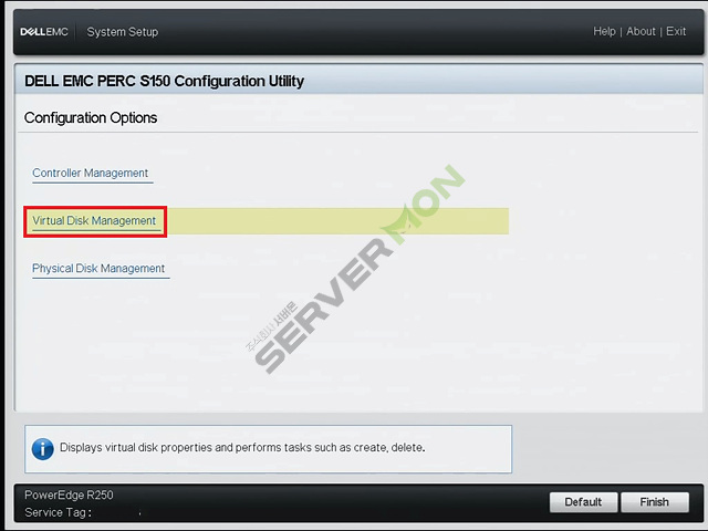 Back 또는 ESC키를 눌러서 S150 Configuration Utility 화면으로 넘어오면 아래의 사진을 참고하여 Virtual Disk Management로 진입합니다.