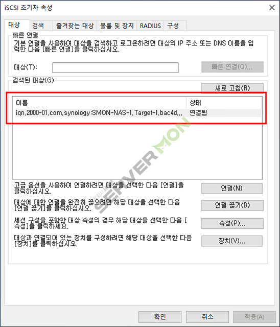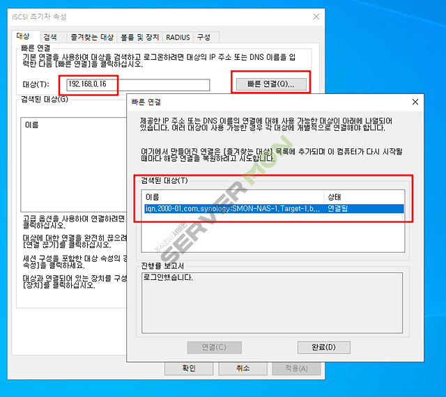 대상에 해당 NAS IP 를 입력 후 빠른연결 을 누르면 이전 설정한 target 이 바로 나옵니다.