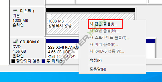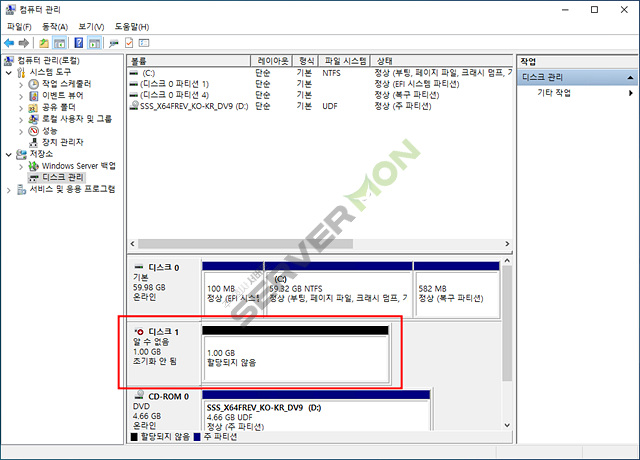 디스크 관리에 들어가 연결된 디스크를 설정 합니다.