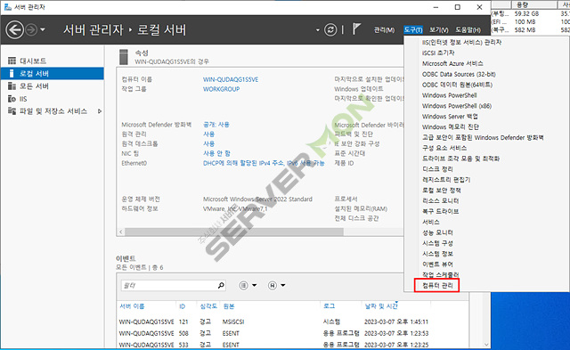 서버 관리자 에서 '컴퓨터 관리' 를 선택해 줍니다.