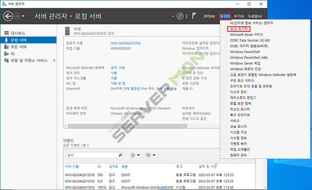 서버 관리자 에서 iscsi 초기자 를 통해 설정 합니다.