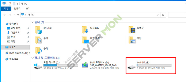 iSCSI 로 연결한 드라이브에 저장한 파일들은 iSCSI 로 연결했을 때만 볼 수 있습니다.
