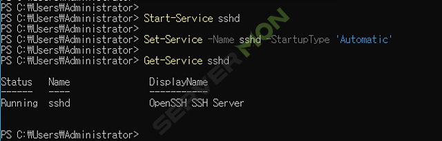 - Set-Service -Name sshd -StartupType 'Automatic' / 서버 시작 시마다 실행되도록 설정
