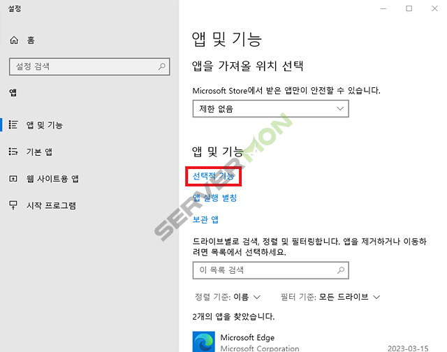 1) Windows 검색에서 앱 및 기능을 실행 시킨 후, 선택적 기능을 선택 합니다.