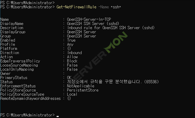 - Get-NetFirewallRule -Name *ssh* / SSH와 관련된 방화벽 허용 상태 확인