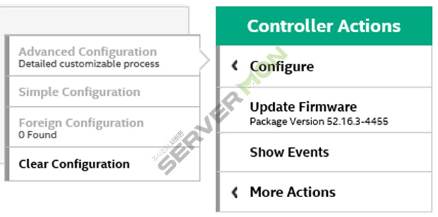 - Clear Configuration : 컨트롤러에서 현재 구성된 모든 논리 드라이브를 제거하는 기능으로, 모든 데이터가 제거됨