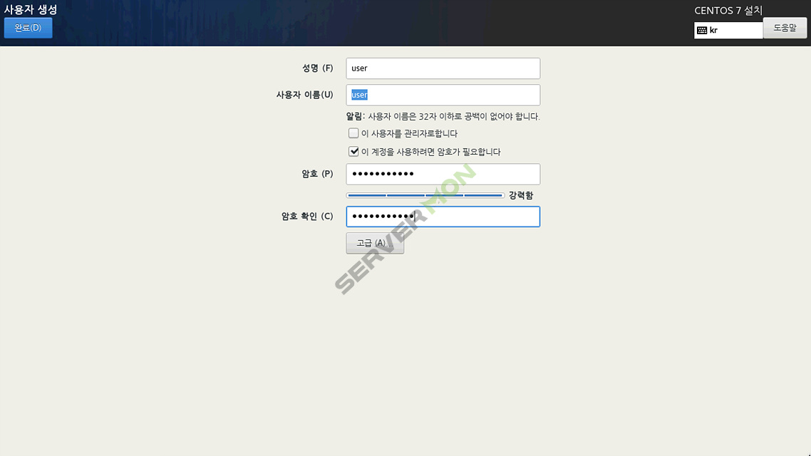사용자 계정 생성에 필요한 입력값들을 모두 입력 후 '완료 (D)'를 클릭합니다.