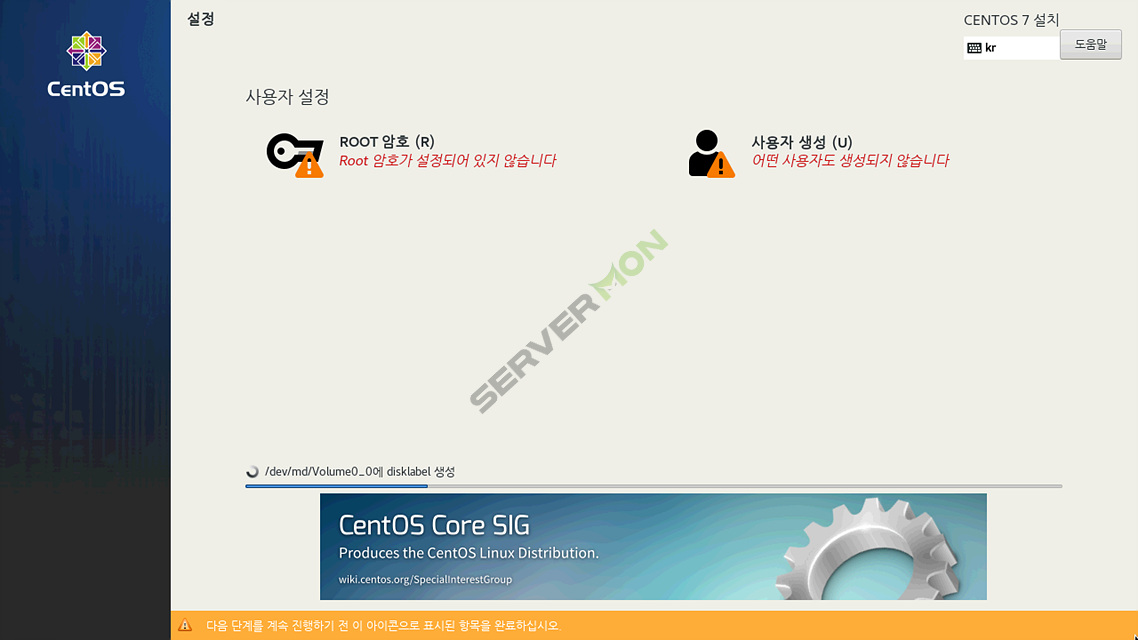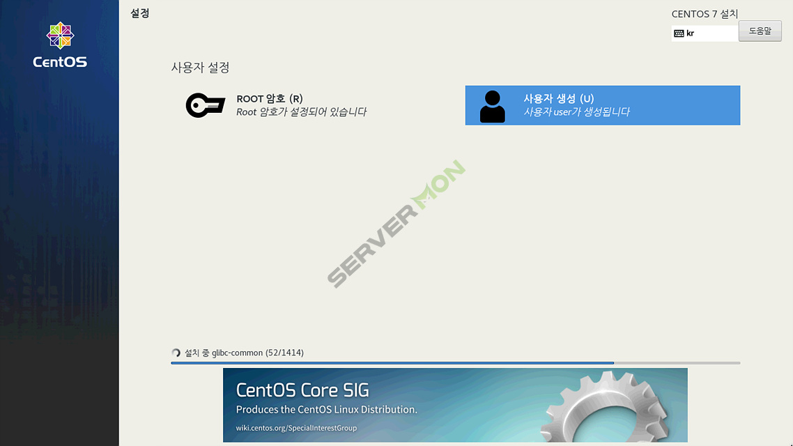 설치가 시작되었습니다. 설치를 기다리는 동안 Root계정의 암호설정 및 사용자를 생성할 수 있습니다.