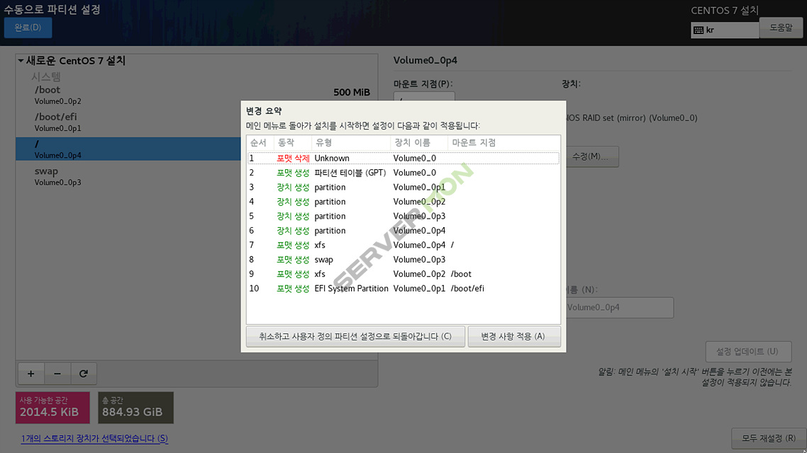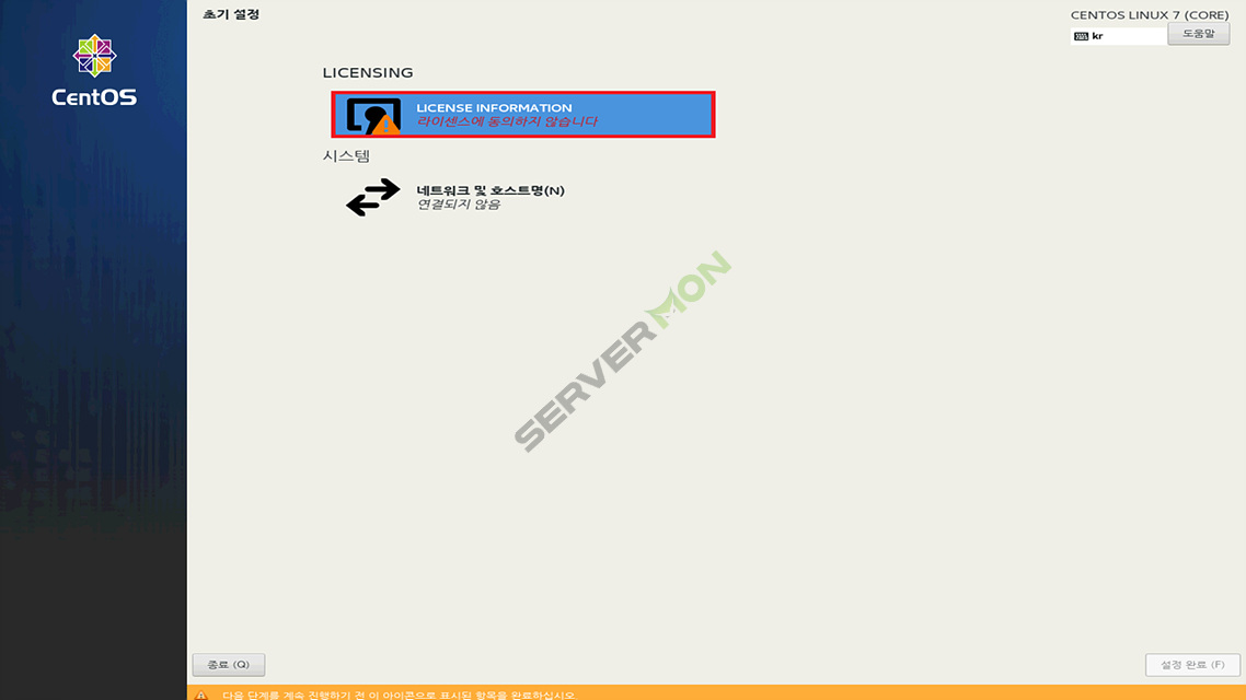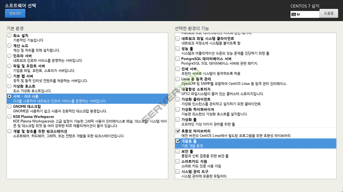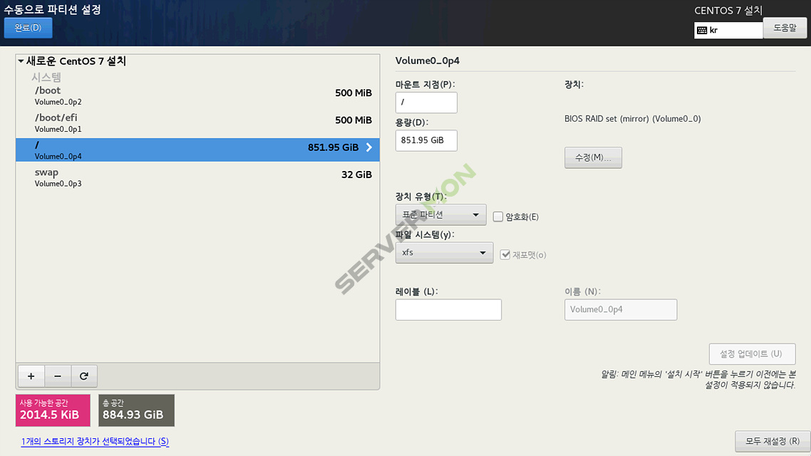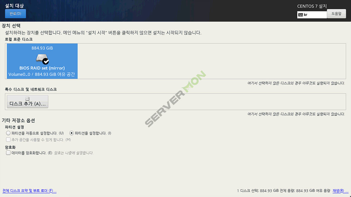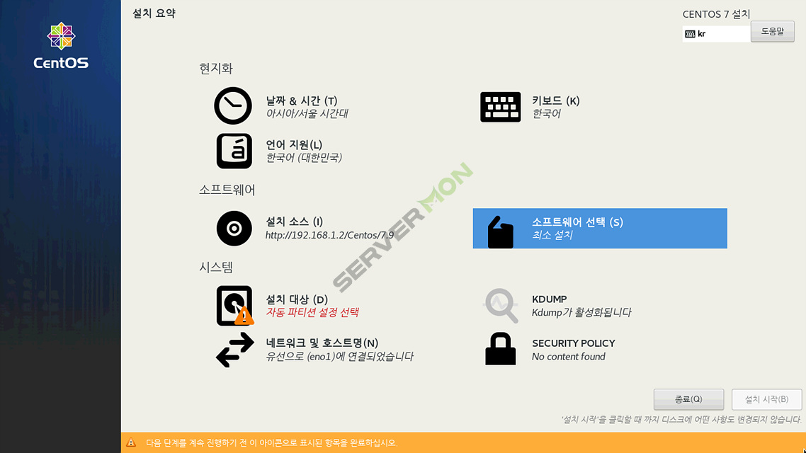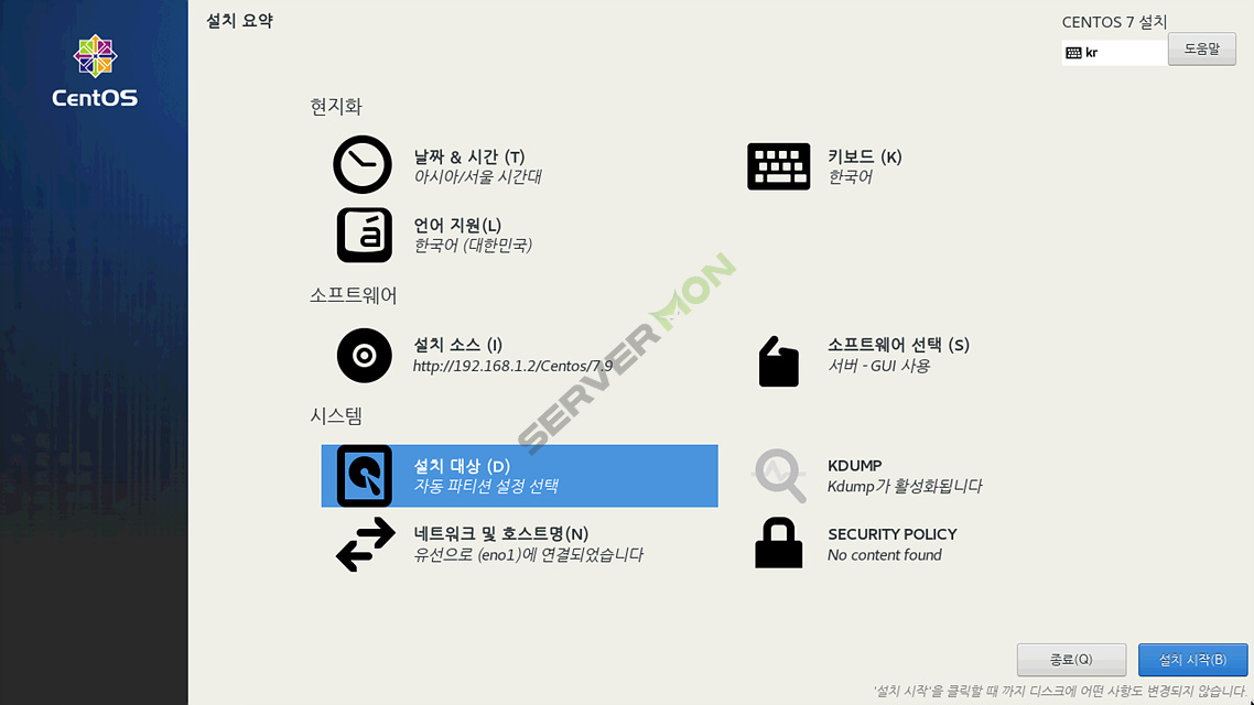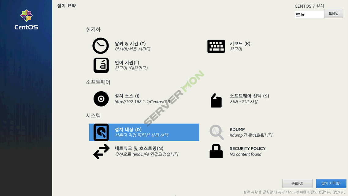 * 본 포스팅에서는 소프트웨어 선택에서는 '서버 - GUI'를, 설치대상에서는 수동 파티셔닝을 진행하여 화면과같이 확인할 수 있습니다.