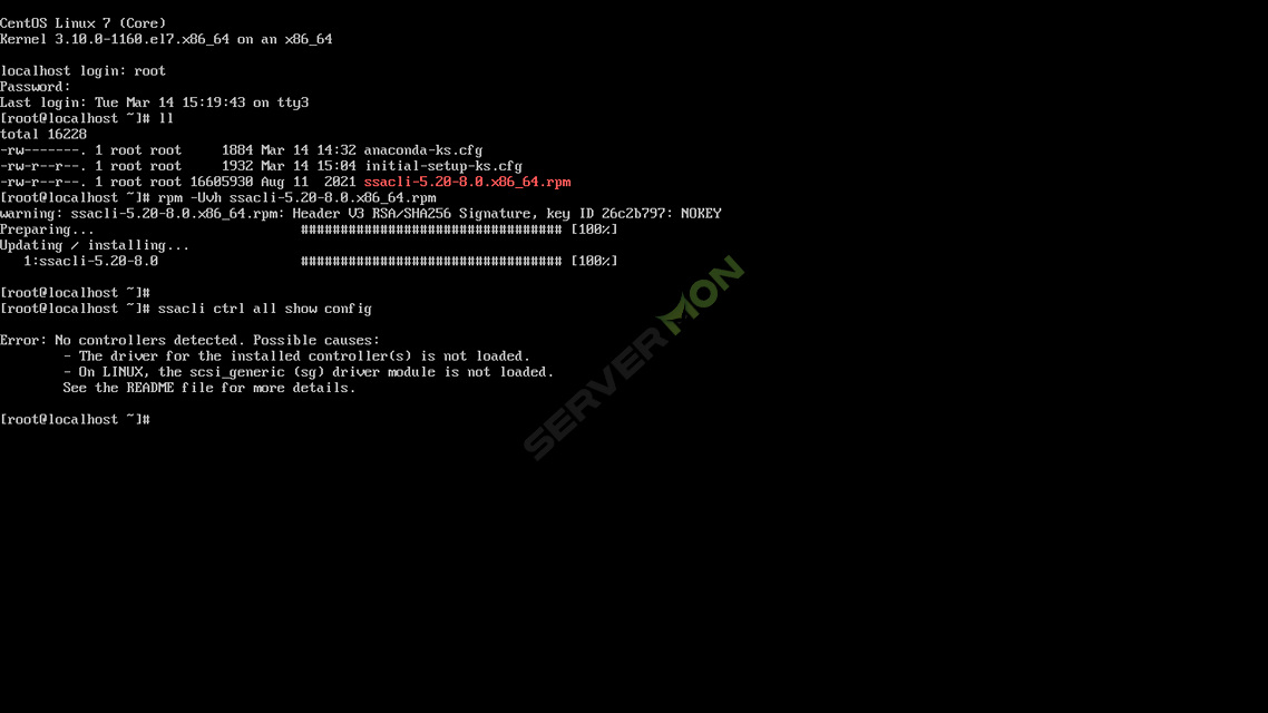 따라서 사진과같이 ssacli 명령어를 입력하면 컨트롤러가 확인되지 않는다는 에러문구가 출력됩니다.