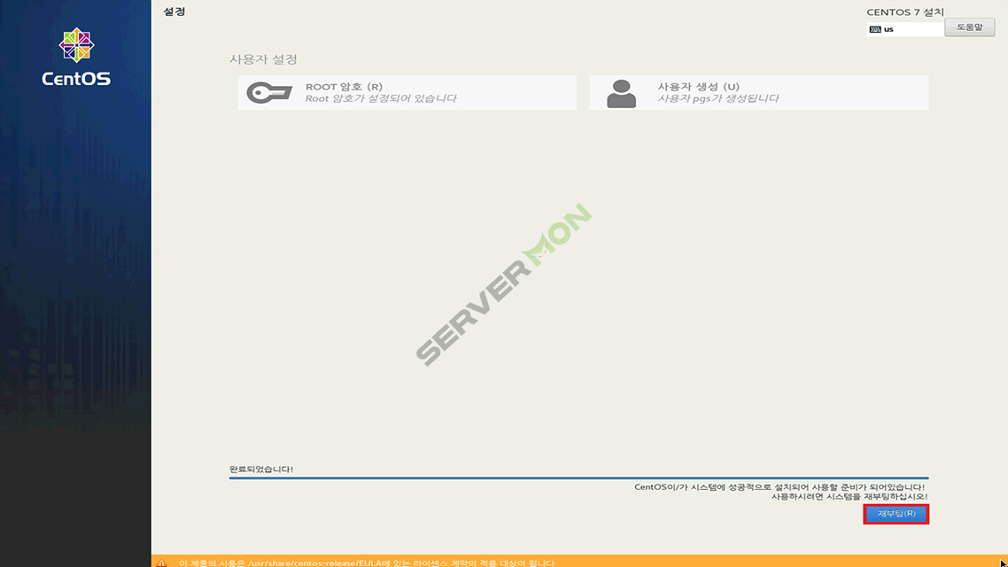 설치가 완료되었습니다. '재부팅 (R)'을 클릭하여 재부팅을 시도합니다.