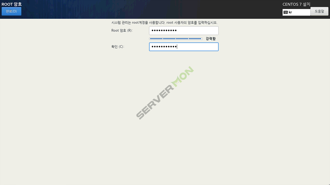 Root암호 및 확인을 위한 재입력을 진행합니다. 이후 '완료 (D)'를 클릭하여 Root계정의 암호설정을 완료합니다.