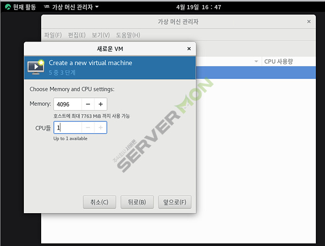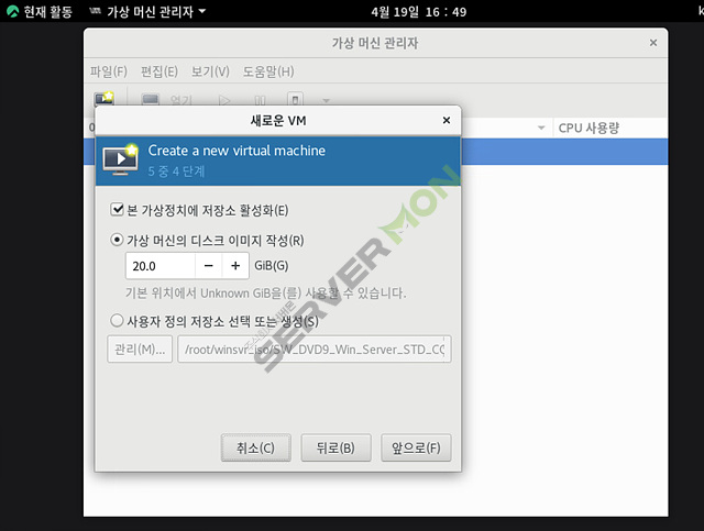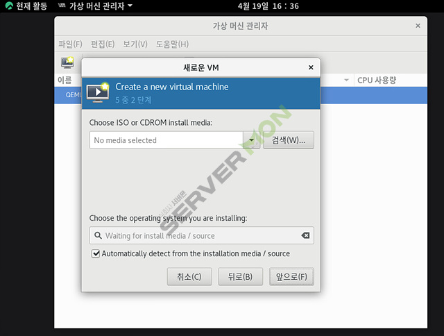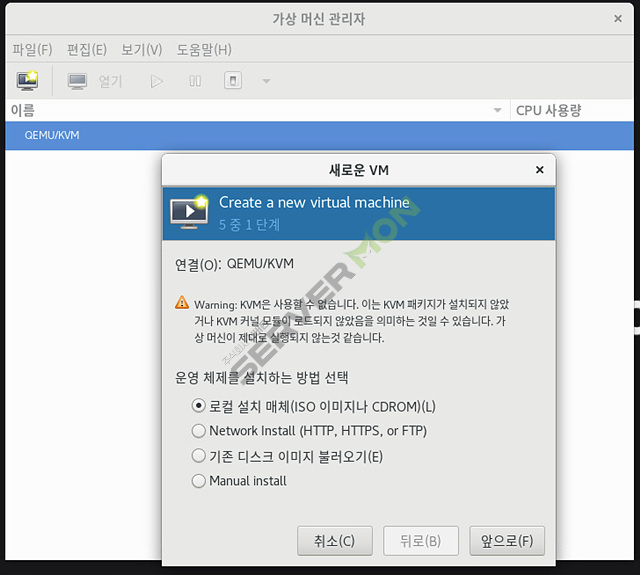 # 가상 머신 관리자 에서 옵션을 선택하며 OS 설치 설정을 진행합니다.