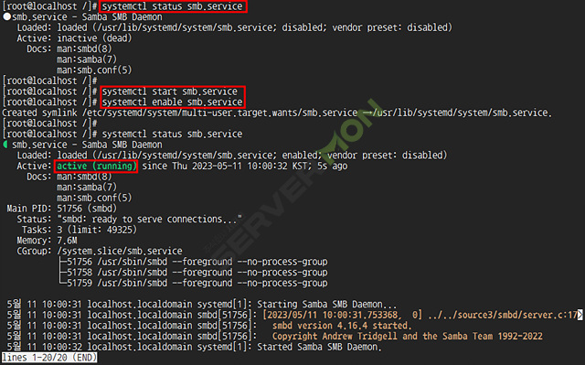 # systemctl enable smb.service - 부팅 후 자동으로 active 될 수 있도록 enable