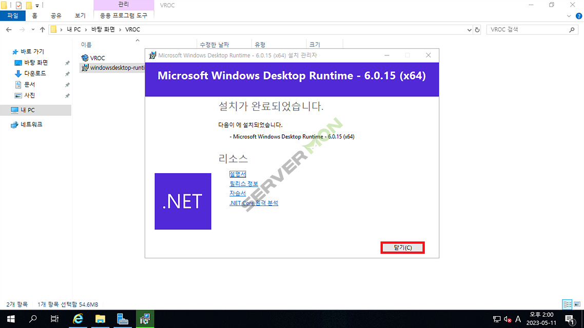 Microsoft Windows Desktop Runtime의 설치가 완료된 모습입니다.