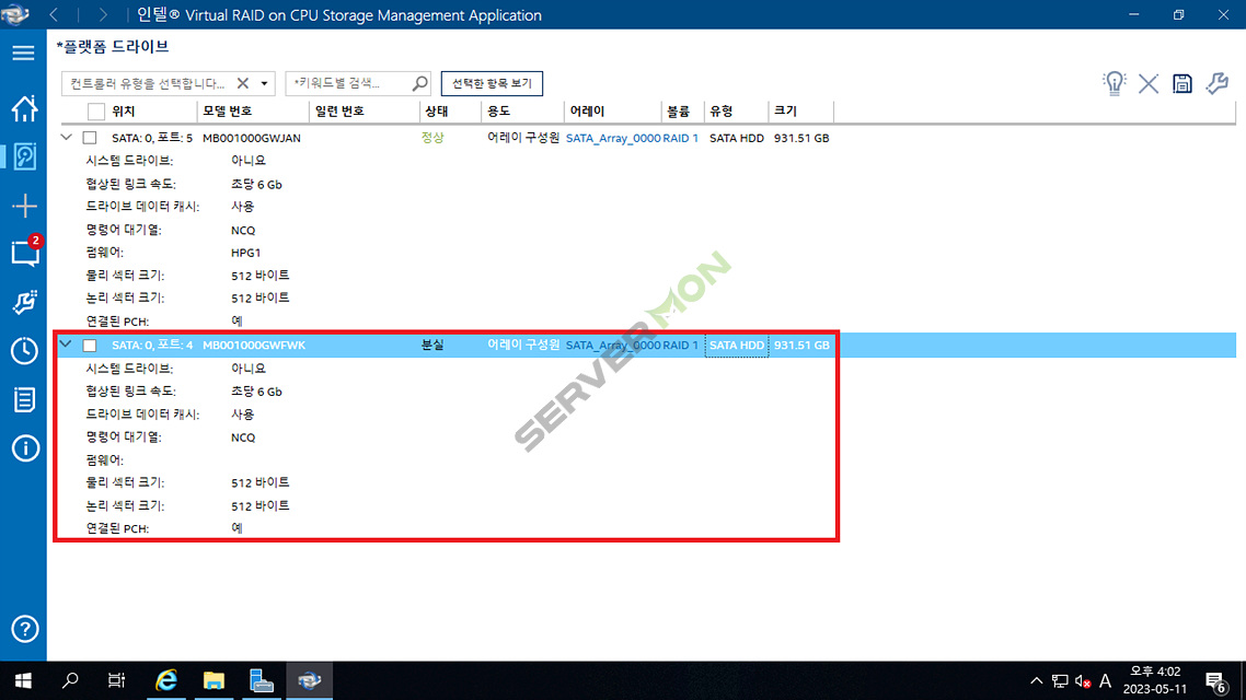 현재 '포트:4'의 디스크가 고장난것으로 확인되었습니다.