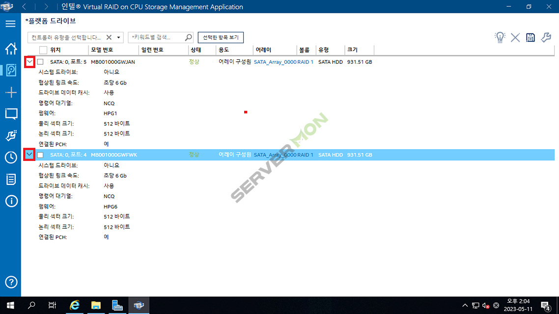 디스크 목록에서 좌측의 '>'버튼을 클릭하여 디스크의 현재상태를 보다 자세히 확인할 수 있습니다.