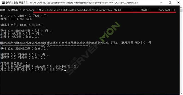 아래 명령어로 Standard 평가판을 Standard 일반으로 전환해 봅니다.