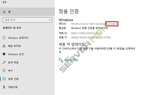 에러가 발생하는 이유는 이 라이선스 키가 Windows Server 2019 Standard 에디션 용도이지 평가판 용도가 아니기 때문입니다.
