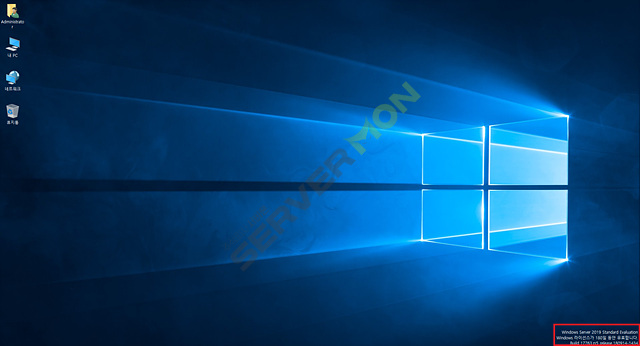 Windows Server 에디션 변경이 완료된 후의 바탕화면은 아래의 사진과 같이 더 이상 바탕화면의 우측하단에 "Windows 라이선스가 180일 동안 유효합니다." 메시지가 표시되지 않습니다.