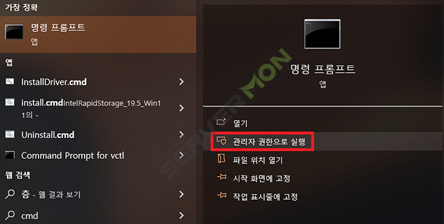 아래의 사진처럼 명령프롬프트를 관리자 권한으로 실행시켜줍니다.