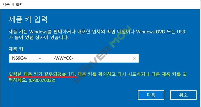 평가판 버전에서 일반버전의 라이선스 키를 입력하여 정품인증을 시도하면 아래의 사진과 같이 표시되면서 인증이 되지 않는 모습을 볼 수 있습니다.