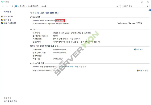 그리고 시스템 속성에서 Windows 버전에도 "Evaluation"이라는 글씨가 함께 표시됩니다.