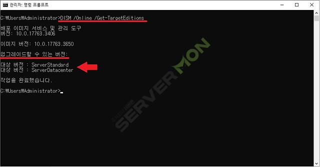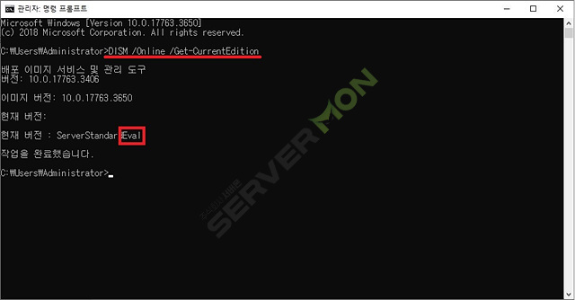 그렇다면 평가판에서 어떤 에디션으로 변경이 가능할지 아래의 명령어를 통해 확인해 봅니다.
