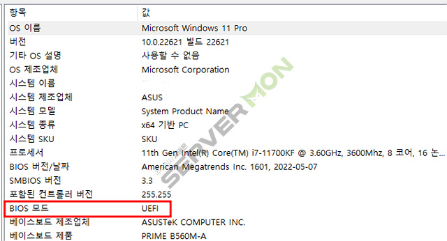 2. 시스템 정보창의 BIOS 모드 값을 확인합니다.