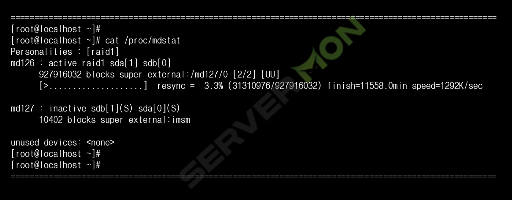 'cat /proc/mdstat'을 입력하여 RAID상태를 확인합니다.