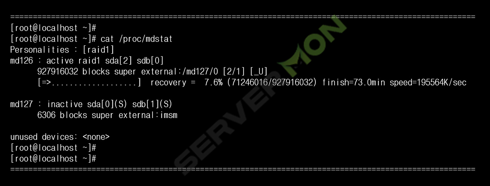 'cat /proc/mdstat'을 입력하여 RAID상태를 확인합니다.