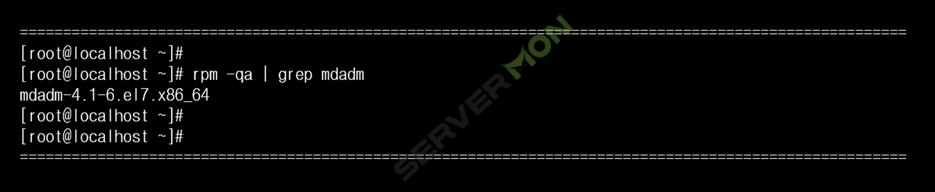 'rpm -qa | grep mdadm'를 입력하여 mdadm이 설치되어 있는지 확인합니다.