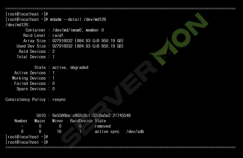 앞서 제거한 디스크가 제대로 목록에서 제거되었는지 mdadm을 통해 확인합니다.
