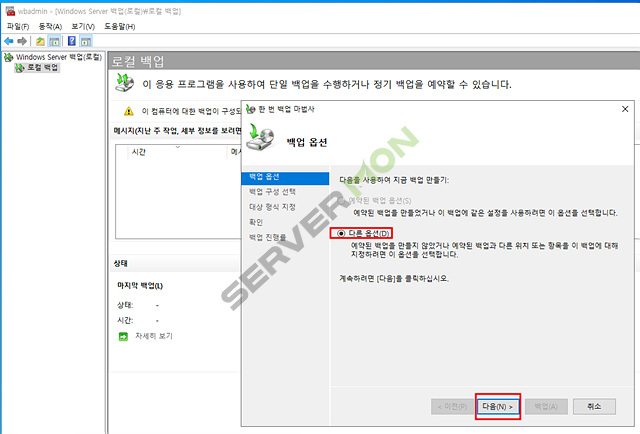 예약된 백업이 없으니 다른 옵션 선택 후 다음.