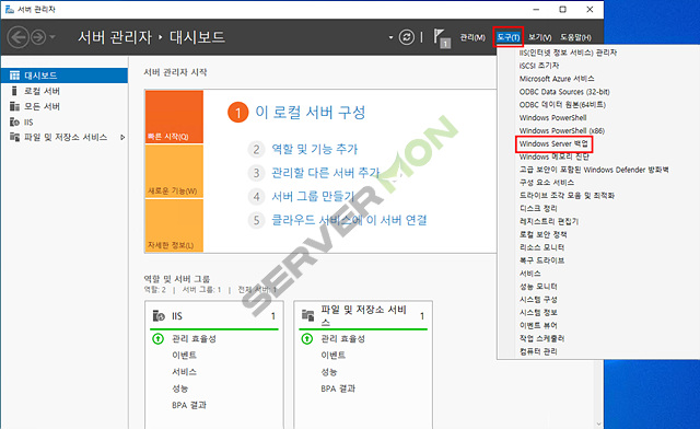 서버 관리자 에서 도구 를 클릭하시면 windows server 백업 란이 생성 되었습니다.