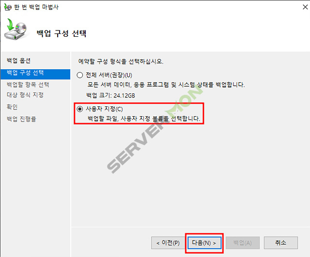 단순 볼륨백업을 진행 예정이니 사용자 지정 백업 선택 후 넘어가겠습니다.