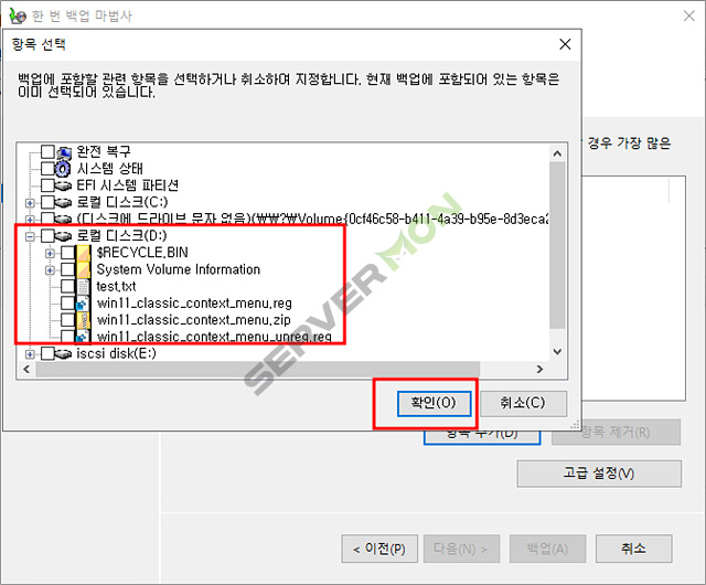 테스트를 위한 D 드라이브 볼륨을 체크 후 확인.