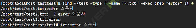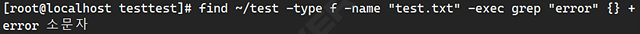 이 예시에서는 ~/test 경로에서 파일명이 test.txt인 파일을 찾고, 해당 파일에서 "error"라는 키워드를 검색합니다.