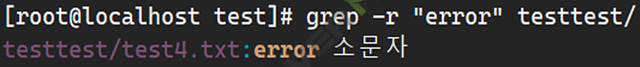 이 예시에서는 ~/test 디렉토리와 하위 디렉토리에서 파일을 검색하고, 각 파일에서 "error"가 포함된 라인을 출력합니다.