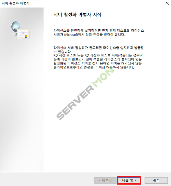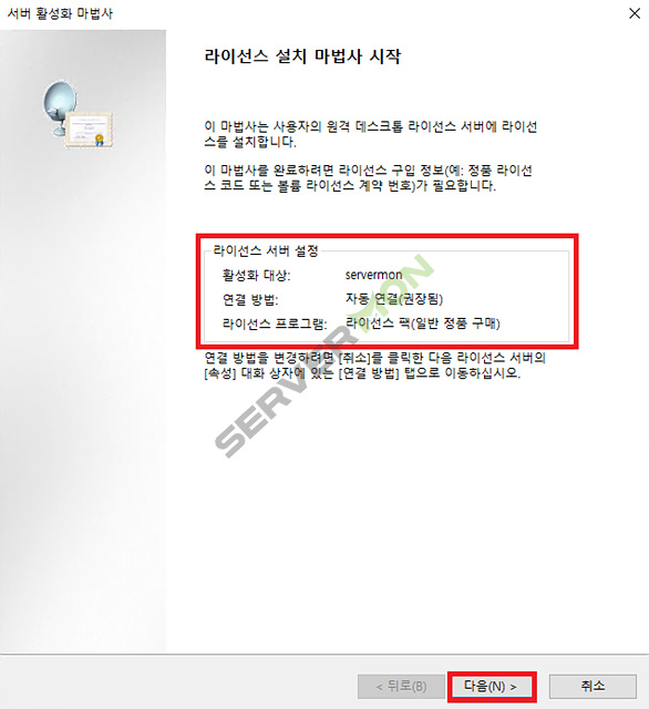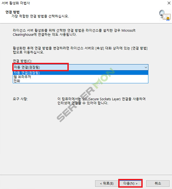 3) 서버 활성화 마법사로 들어오면 첫화면에서 다음을 누르고 연결 방법에서는 자동연결을 선택 합니다.